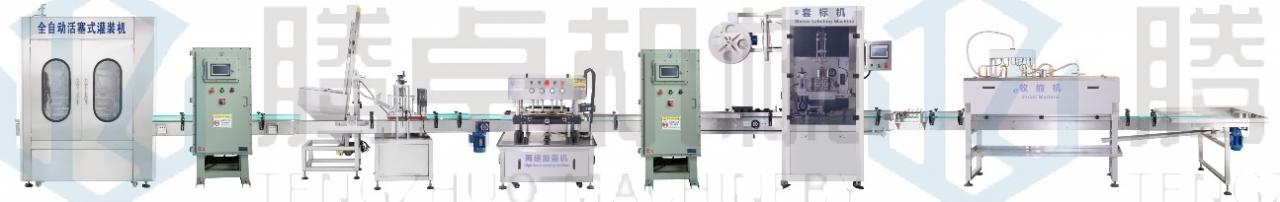 完成動作:人工放瓶-自動灌裝-機(jī)器放蓋-自動旋蓋–自動套標(biāo)收縮-人工收瓶